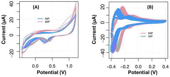 Figure 5). The formation of the MIP film was suggested by the increasing reduction current produced by the electrodes and a potential shift. In contrast, the NIP yielded a more intense potential shift for a lower peak current.