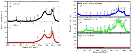 Figure 4c) had no relevant peaks to comment, as expected for a gold material observed in Raman spectroscopy. In contrast, the modification of this gold electrode with TH solution that underwent the CV procedure yielded a spectrum with a wide range of vibrations, as evidenced in