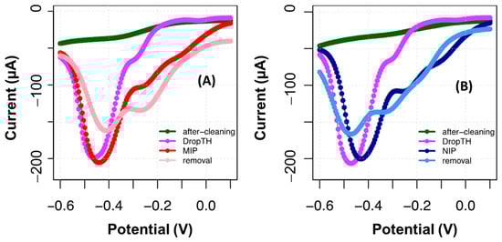 After template removal, a significant current decrease was observed, along with a shift in peak potentials. This tendency was more evident in the NIP, which was also subject to a template removal procedure, only for control purposes. This behavior of the NIP evidenced the extraction from the electrode surface of di- to oligomeric compounds to TH that were not firmly attached. It could also signal chemical changes occurring on PTH after contact with oxalic acid. In addition, the peak shifting to −0.25 V in the NIP also became more intense than that in MIP. By comparing this behavior with the control NIP, the changes in the MIP could be related to the fact that some protein molecules remained entrapped within the polymeric network.