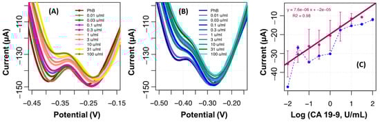 Figure 8. Overall, the reduction peak signaling the presence of PTH was also the presence at about −0.5 V (it is important to note that the solutions were deaerated with nitrogen before reading) and the reduction peak tended to decrease in the presence of CA 19-9. This tendency showed a linear dependency with log CA 19-9 concentration from 0.10 U/mL to 100 U/mL. As before, the NIP displayed a random behavior, thereby confirming that the response obtained for CA 19-9 depended mostly on interactions between the target protein and the binding sites.