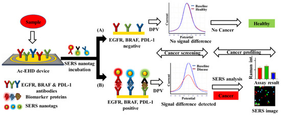 In this proof-of-concept study, we report a dual detection biosensor platform that screens for a panel of cancer-associated protein biomarkers (i.e., BRAF, EGFR, PDL-1) by an electrochemical ensemble measurement using DPV and profiles the individual biomarker levels using SERS. Within this biosensor platform, the application of alternating current electrohydrodynamics (ac-EHD) induces a nanomixng phenomenon that facilitates rapid and enhanced target capture by increasing the collision frequencies between target molecules and capture antibodies, reduces nonspecific adsorption and facilitates labelling of antibody coated SERS tags to the captured biomolecules [23,28,34]. Following capture, the biosensor platform utilizes an DPV for ensemble biomarker detection that can sense minute amount of molecule absorbance on the sensing surface and present results in the form of peak current change. To further investigate the presence of individual biomarkers on sensing surface and their level of expression, we adopted a SERS method by engaging laser to the sensing surface to record SERS signals that correspond to the amount of individual biomarkers captured on the surface. Our method is simple, rapid (total 10 min assay time), sensitive and provide two independent readouts from the same sample to extract crucial molecular information of the disease that may also help to increase the confidence level of the biosensing technique. We believe this screening technique for assaying ensemble and individual clinically relevant cancer specific soluble biomarkers can be utilized for conveying critical information for disease management and may have the potential to be integrated in the clinical settings.