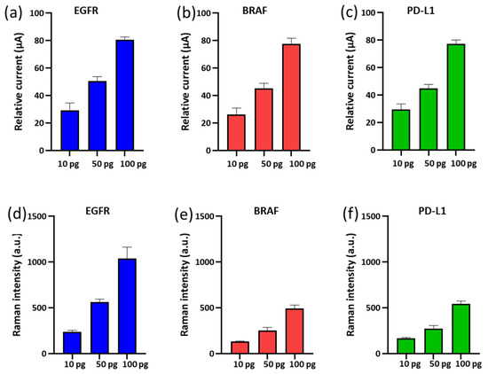 To evaluate the feasibility of this platform for ensemble and individual circulating protein detection, it is important to individually challenge the functionalized surface with different concentration of target proteins separately and then assay corresponding electrochemical and SERS signals. Firstly, we ran experiments with three different amounts of EGFR samples, i.e., 10 pg (1 ng/mL), 50 pg (5 ng/mL) and 100 pg (10 ng/mL) and recorded both DPV and SERS signals (Figure 3a,d). From the electrochemical assay small signal reduction was recorded for 10 pg proteins (~30%) where DPV signal was significantly reduced when the experiment was performed with 100 pg EGFR proteins (~80%). A possible explanation of these observation could be attributed to the larger surface coverage in case of 100 pg protein experiments that inhibited the diffusion and the electron transfer towards the electrode surfaces (i.e., hinder redox reaction) hence produced less current [40]. In agreement with the electrochemical read-out, the SERS experiments recorded higher Raman signals for experiments with 100 pg protein solution than the 50 pg and 10 pg. This signal intensities can be explained by the presence of larger amount of SERS nanotags when more target proteins were captured on the surface and labelled with larger amount of SERS nanotags [41]. Similar observations were also recorded for BRAF and PDL-1 protein samples when ran separately with the above mentioned amounts (Figure 3b,c,e,f).