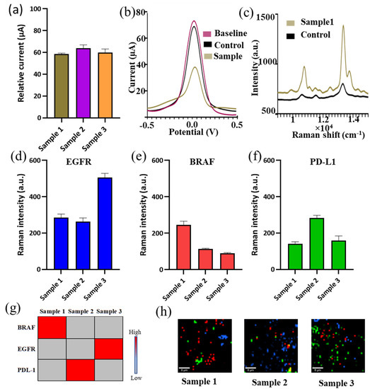 Finally, we performed experiments with three different mixtures of target protein solutions for both ensemble protein analysis with DPV and individual protein analysis with SERS. For the analysis of mixed population, three different samples were prepared where the total circulating protein concentration was 70 pg. Sample 1 contained 50 pg of BRAF, 10 pg of EGFR and 10 pg of PDL-1. Sample 2 contained 10 pg BRAF, 10 pg EGFR and 50 pg PDL-1. Sample 3 contained 10 pg BRAF, 50 pg EGFR and 10 pg PDL-1. The sample volume was kept constant at 10 µL. As the total amount of protein remained constant (i.e., 70 pg), we expected to observe a similar DPV signal change for the three tested samples. Indeed, the DPV signals for all the samples showed similar current change (~60%) (Figure 4a). Figure 4b,c shows a representative example for the analysis of sample 1 with ensemble protein analysis by DPV and individual protein analysis by SERS. These findings also highlight the essentiality of having a dual readout method for heterogenous sample analysis as similar current changes were recorded for all three samples although each sample contained different amount of individual proteins. Further analysis of each samples using SERS spectra clearly mapped individual protein expressions in samples 1–3. Results of EGFR expression in all three samples are presented in Figure 4d, where SERS intensity obtained for EGFR protein detection for sample 3 was similar to the intensity for 50 pg of EGFR protein recorded in Figure 3d and for other two samples, SERS intensities for EGFR was similar to the intensity recorded for 10 pg in Figure 3d. Similarly, in Figure 4e,f BRAF and PDL-1 signals for sample 1 and 2 also showed matching SERS signals for BRAF (50 pg) and PDL-1 (50 pg) in Figure 3e,f, respectively. SERS signals for BRAF protein in sample 2 and 3 were similar to SERS signal of 10 pg (1 ng/mL) when detected separately (Figure 3e). Low SERS signals were also detected for PDL-1 in sample 1 and 3 as expected due to their low amount (10 pg) in these two samples. (Figure 4f) A heatmap in Figure 4g presents SERS intensity profile of all three proteins in each sample where grey colour represents low SERS signal correspond to less target protein where red colour represent strong SERS signal that represents to more protein capture. (Figure 4g) SERS images of all three samples also reflects the presence of different protein amounts in each samples depicted by three different coloured dots (red = BRAF, green = EGFR, and blue = PDL-1) (Figure 4h). This results clearly demonstrate the feasibility of the current assay platform for ensemble and individual circulating biomarkers analysis in the same sample.