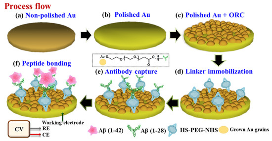 The peptide conjugation with gold substrate involved three steps. First, a 40 µL of 10 mM PEG linker (HS-PEG-NHS) diluted in DI water was dropped on the gold electrode surface. The electrode was then incubated for 6 h at 4 °C and washed three times. Second, a 40 µL of 10 mM antibody Aβ (1–28) in phosphate buffer saline (PBS) and Tween-20 (PBST) was dropped onto the PEG functionalized-surface and incubated for 12 h at 4 °C. The electrode was washed three times with PBST before being used in the subsequent step. Finally, a 20 µL Aβ (1–42) peptide with a concentration of 10−2–106 pg/mL in phosphate buffer saline (PBS) was dropped onto the gold surface and incubated at 4 °C for 4 h. The electrodes were then washed with PBS to remove residual peptide and dried in nitrogen (N2) gas before use. The step-by-step workflow of the ORC nanorestructuring and surface modification is presented in Figure 1.