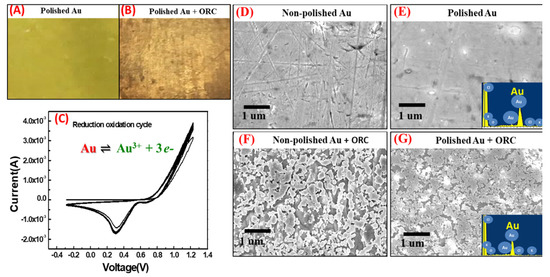 The surface morphological study of the proposed techniques is presented in FE-SEM figures in Figure 2D–G. Pure gold electrodes were observed in our initial stage with and without Al polishing treatment. It is demonstrated in Figure 2D,E that the non-polished Au substrate showed harsher morphology than the polished one. The non-polished Au also showed more scratches and impurities on its surface than the polished surface carried out in ORC treatment, despite the non-polished Au initially having exhibited more contoured structure; however, after ORC, less uniform with highly clustered Au grains and lower uniformity of Au grains size were observed (Figure 2F).