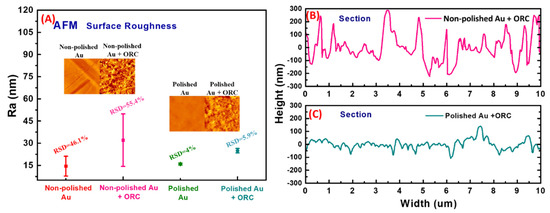 (A) Surface roughness profiles from AFM analysis of the Au substrate having undergone different treatments, and the height profile of (B) non-polished and (C) polished Au surface after ORC treatment.