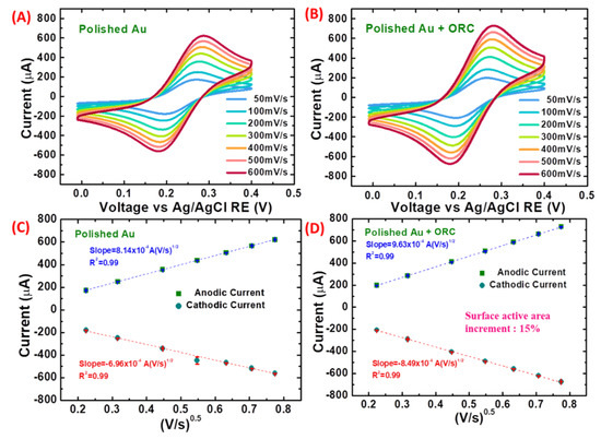 To deeply comprehend the impact of polishing and ORC treatment on the Au substrate, the study was conducted towards calculating the surface area based on the cyclic voltammetry analysis. Figure 4A,B represent the cyclic voltammograms of a 50 mM PBS solution containing 5 mM K3[Fe(CN)6]/K4[Fe(CN)6] and 0.5 M KCl mixture for the polished gold surface with and without ORC treatment. The scan rate and the peak current gradually increased proportionally to ν1/2 on gold surfaces both treated with and without ORC, as displayed in Figure 4C,D, implying that the reaction was under a quasi-reversible process typically found in Au nanoparticles studies for nanopatterning [37,38]. However, the impact of morphological and topological characters after ORC treatment in generating more current response through the oxidation and reduction reaction of ferri/ferrocyanide ions onto the surface was conspicuously displayed in more significant current-based peak-to-peak separation in Figure 4B, as well as being indicative of the more substantial diffusion coefficient. The electroactive surface area and diffusion coefficient were calculated using the mechanism based on electron transfer via the Randles–Sevcik equation [39,40,41]: