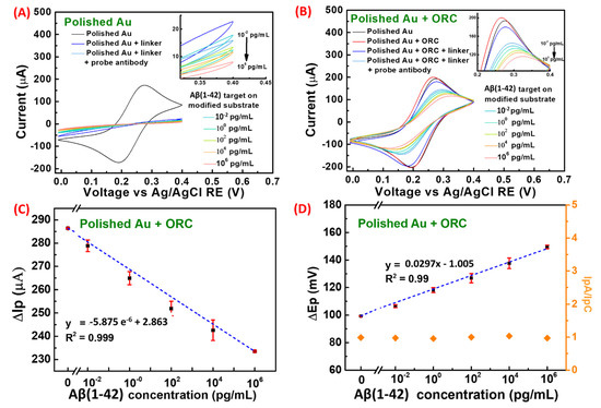 Alzheimer’s disease (AD) is typically diagnosed from the occurrence of protein lesions in the brain, and the β-amyloid Aβ (1–42) protein has been shown to be much higher in the incidence of AD patients. Among other AD biomarkers, Aβ (1–42) protein has been highly noted as an important precursor since 1987 [42]. In this work, as a proof of concept in early detection of AD, the ORC engineered Au substrate was applied as an electrochemical sensor. The uniformly grown Au grains would promote the effective adhesion of protein Aβ (1–28) probes in a high surface area and control the density of the probe molecules, which later provide high binding efficiency with target peptide. The use of SH-PEG-NHS on anchoring the antibody Aβ (1–42) facilitates a straightforward and stable crosslinking process with no other activation steps required. The SH-PEG-NHS is a common linker used in modifying proteins and drugs since the NHS ester reacts with the primary amine group of antibody/proteins at pH 7–8.5 to form a stable amide bond [43,44]. It can also suppress the non-specific binding of charged molecules to the modified surfaces. PEGylation can increase solubility and stability and reduce immunogenicity of peptides and proteins. A similar procedure has been reported before for the immobilization of α-synuclein (αS) protein on a gold surface in near-field effect detection [45,46]. The detection of Aβ (1–42) protein and corresponding CV analysis for the detection of 10−2 to 106 pg/mL is displayed in Figure 5. It is also observed that in the polished Au substrate without ORC in Figure 5A, the CV curves did not show complete redox peaks at the given voltage range.