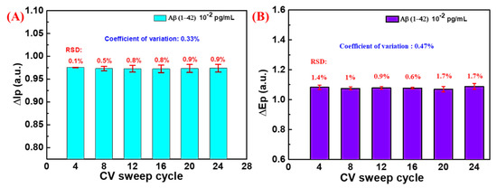 The stability of the ORC nanorestructured Au substrate in the measurement of Aβ (1–42) peptide was studied in the ΔIp and ΔEp variation against numbers of cycles. In Figure 6A,B, in the detection of target peptide with a range of concentration under a series of cycle numbers, the current and voltage signals did not vary as much, as shown by a significant coefficient of variation (CV) value of less than 0.5% resulting from three different substrates at various numbers of cycles, respectively, in all cycles tested. This reflects that the sensor possesses excellent stability even for such high cycling set up and with lower Aβ (1–42) concentrations and that the solid biomolecular adhesion and interaction were still preserved despite highly repeated measurements. Moreover, it is noteworthy that the stability confirms the reproducibility of the Au grains over the substrate created through the ORC after a repetitive measurement, which concomitantly counters the issue of deposited metal exfoliation as the effect of high cycle numbers. When compared with the previously published works of literature that have highlighted the surface engineering of sensor and platform structures for Aβ proteins detection, shown in Table 1, the ORC nanorestructured Au electrode performs outstandingly, surpassing previous work on points such as the ease and cost-effectiveness of sensor fabrication, wider dynamic range, and low LoD.