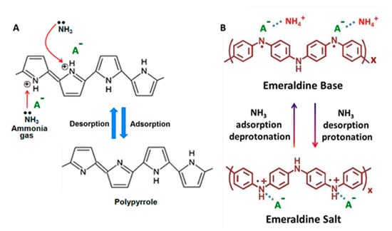 A common air pollutant is gaseous NH3. In small quantities it is harmless, but in high concentrations can lead to skin and eye irritation, the destruction of the respiratory tract mucosa, and even death. Sources of NH3 in the air are industrial manufacturing, automobile exhaust, animal husbandry or urea manufacturing for agricultural applications. NH3 is also present in the human breath in small quantities (400–14,700 ppb) and its detection can be used as a noninvasive clinical diagnostic [99] of hepatic encephalopathy [100], end-stage renal disease (ESRD) [101], halitosis [102] orhelicobacter pylori inflection [103]. The most amply employed conductive polymers for gas sensors are polypyrrole and polyaniline. Figure 5 presents the sensing ammonia mechanism of the PPy and PANi polymers.