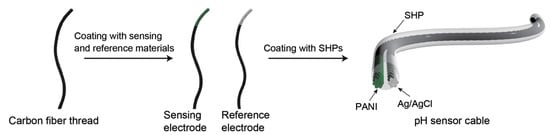 In order to measure pH in small volumes of human fluid (sweat, saliva, tears, urine), Yoon et al. [162] prepared a robust and self-healing pH sensor by weaving two carbon fiber threats electrodes and coating it with a self-healing polymer (SHP). The pH sensing fiber was prepared by electropolymerization of PANI and the reference electrode fiber was prepared by coating the carbon fiber with an Ag/AgCl ink (Figure 6). Poly(1,4-cyclohexanedimethanol succinate-co-citrate), the SHP, was able to successfully heal mechanical damages (efficiency up to 98% after 4 cycles of cutting and healing). Moreover, the high flexibility and thinness of the pH sensor makes it eligible for incorporation in clothing, resulting in a wearable pH sensing system.