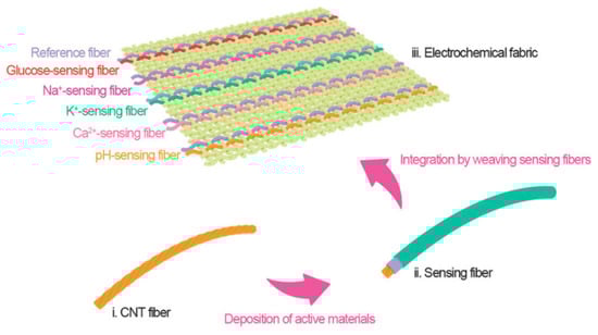 - Wang, L.; Wang, L.; Zhang, Y.; Pan, J.; Li, S.; Sun, X.; Zhang, B.; Peng, H. Weaving sensing fibers into electrochemical fabric for real-time health monitoring. Adv. Funct. Mater. 2018, 28, 1804456. [Google Scholar] [CrossRef]