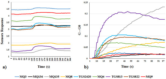 Sensor response signals for the e-nose were expressed as a conductivity ratio, symbolized as (G-G0) on the y-axis of the sensor array output. G refers to the conductivity of the sensor upon exposure to the target gas sensor whereas G0 signifies the conductivity of the gas sensor when exposed to the cleaning air. In this study, the mean value of the relatively stable phase of the response curve was extracted from each e-nose sensor within the sensor array.