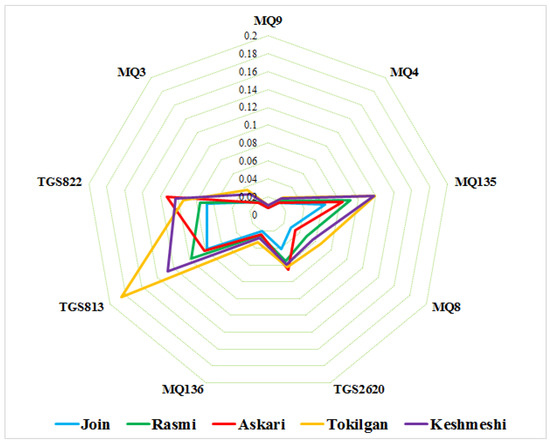 Figure 2). The outputs of nine sensors in the sensor array (sensor numbers 1–9) are arranged in sequential order, clockwise from the top sensor MQ9 (sensor 1) to MQ3 (sensor 9). All output results for the five grape cultivars were plotted simultaneously for visual comparisons on the radar plots.