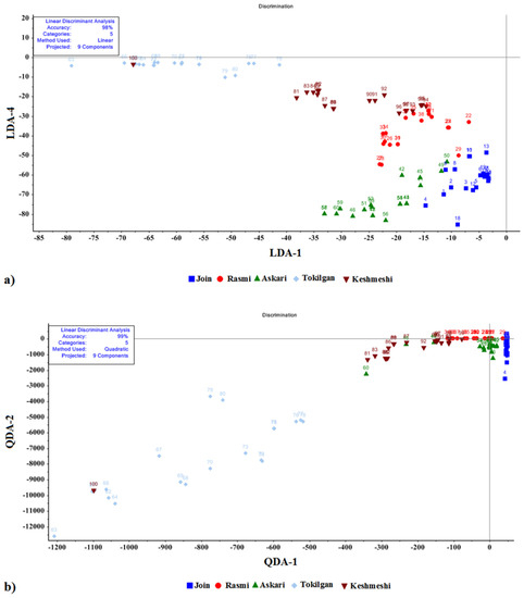 Figure 3a). The model based on the first two principal components showed clear, well separated discriminations between grape samples of the three cultivars Join, Askari, and Keshmeshi. However, there were no distinct data clusters, resulting in relatively low separation and discrimination between cultivars Rasmi and Tokilgan.