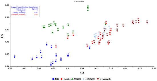 Table 6. Statistical results were calculated using Equations (1)–(6) and their mean values were reported. Among the tested models, ANN and QDA models showed the best performance in the classification of grape cultivars. The highest value of classification recall for the five grape cultivars for both QDA and ANN methods was 99%. Classification precision determined by the Nu-SVM method with sigmoid kernel function was 0.924. Only eight out of 100 input data were misclassified. The SVM model exhibited lower classification accuracy for the five grape cultivars compared to LDA and QDA. ANNs, for the classification of three cultivars (Join, Rasmi, and Askari), were better than results for classification of cultivars Tokilgan and Keshmeshi based on all six performance measures.