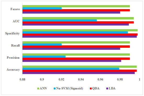 Figure 6 shows test results comparing the performance accuracy of ANN, Nu-SVM, QDA, and LDA methods for classifying the five grape cultivars. Statistical results were calculated using Equations (1)–(6) and their mean values were reported.