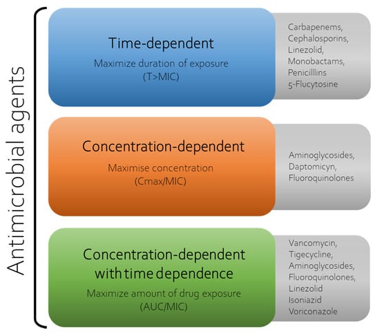 - Concentration-dependent with time-dependent agents. The effect is defined by the AUC0–24 h over a 24 h period divided by the MIC (AUC0–24 h/MIC). This ratio indicates the importance of both time and concentration for optimal effect. Examples are fluoroquinolones, tigecycline, linezolid, and glycopeptides. Specific targets vary according to the antimicrobial.