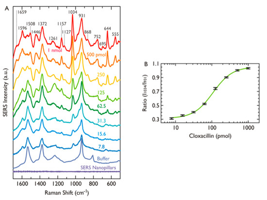 - Markina, N.E.; Markin, A.V. Application of Aluminum Hydroxide for Improvement of Label-Free SERS Detection of Some Cephalosporin Antibiotics in Urine. Biosensors 2019, 9, 91. [Google Scholar] [CrossRef] [Green Version]