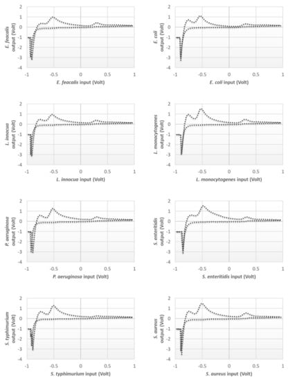 The voltammograms registered for each different microorganism are reported in Figure 2 and Figure 3. Figure 2 shows all the voltammograms in the same picture, in order to show, in evidence, the differences among them. Figure 2 reports eight voltammograms, one for each microorganism, at a fixed concentration (3 Log CFU/mL).