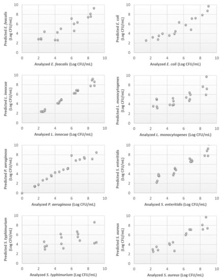 The Root Mean Square Error obtained in Cross Validation (RMSECV), using the Leave One Out criterion, was slightly different among the eight microbial calibration curves, ranging from 1.1 to 2.9 Log CFU/mL (Table 1).