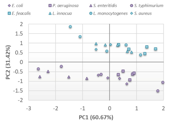 The scores plot of the first two Principal Components (PCs) in Figure 5, accounting for about 92% of the explained variance, highlighted the formation of two distinct clusters along the PC2. Interestingly, although the BIONOTE-L was not able to discriminate effectively between the single strains, all bacteria were clearly grouped based on their belonging to the gram-positive or gram-negative class, in the upper and lower area of the figure, respectively.