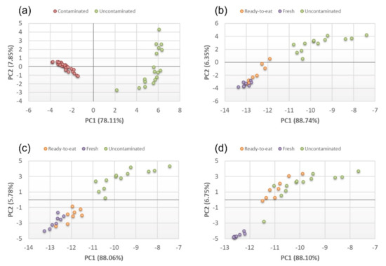 Scores Plot of the first two Principal Components for contaminated and uncontaminated samples. (a) Overall distinction between control and contaminated salads at the highest concentration tested; (b) distinction between control and contaminated salads at 10−3 microbial dilution; (c) distinction between control and contaminated salads at 10−5 microbial dilution; (d) distinction between control and contaminated salads at 10−7 microbial dilution.
