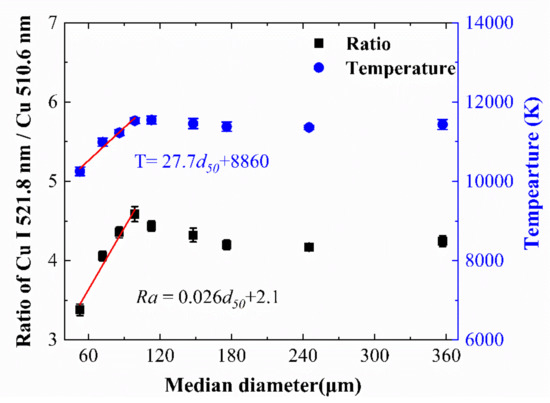 where is the intensity of spectral line with a wavelength related to a degeneracy of upper state and transition probability . is the atomic energy of the upper state, is the Boltzmann constant, is the plasma temperature, is the Planck’s constant, is the speed of light, is the electron density in plasma, and is the partition function. The plasma temperature can be easily calculated from the slope of the plot of versus indicated in Equation (2). Here, the plasma temperature was calculated using the three Cu I lines listed in Table 1. The obtained values of temperature related to different grain median diameters are displayed in Figure 3. One can clearly see that, when < , the plasma temperature increases linearly from 10,250 K to 11,530 K with incremental value from 53 μm to 100 μm; however, when > , the plasma temperature shows a level-off response with the median diameter. This indicates that choosing plasma temperature as an indicator of grain size is feasible for similar copper RPG samples to those used here but having unknown median diameters limited in the range of < .
