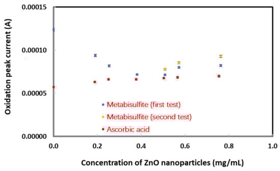 The oxidation peak currents for metabisulfite were compared with those obtained for ascorbic acid, one of the standard antioxidants that are capable of terminating a chain oxidation reaction by eliminating free radical intermediates. They act as antioxidants by being oxidized, hence antioxidants can be considered as reducing agents [60]. However, unlike metabisulfite, the ascorbic acid oxidation peak currents did not change significantly with increasing ZnO nanoparticle concentrations up to 0.75 mg/mL. These results suggest that ascorbic acid, albeit well known to be an antioxidant providing protection against oxidative stress-induced cellular damage by scavenging of ROS, does not react quickly with ZnO nanoparticles in an aqueous suspension during a contact time of 5 min.