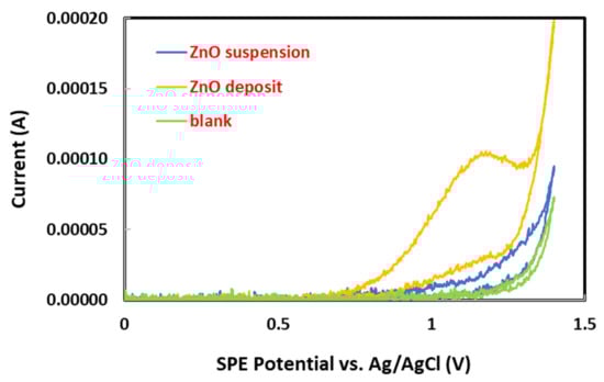 Sodium metabisulfite (Na2S2O5) is an inorganic salt of sulfurous acid that dissolves in water to form sodium, bisulfite and sulfite ions: Na2S2O5 + H2 O = 2Na+ + 2HSO3− and HSO3− = H+ + SO32− [43]. When oxygen is present, bisulfite anions are converted to sulfate anions: 2HSO3− + O2 = 2H+ + 2SO42−. The salt is commonly used as an antioxidant agent in a variety of pharmaceutical formulations and dental base materials [44,45,46], cosmetics and personal care products [47,48], cookies and crackers [49], reverse osmosis systems [50], food packaging films [51] and aluminum alloys [52]. A glassy carbon electrode was modified with a porphyrin complex film for the analysis of sodium metabisulfite in pharmaceuticals. A unique anodic peak at 0.5 V was attributed to the oxidation of sulfite to sulfate [53]. The influence of metabisulfite on the platinum electrode had previously been analyzed by CV. An anodic peak was observed in the region −0.6 V to −0.3 V vs. SCE in the anodic potential direction and a corresponding cathodic peak in the region −0.5 V to −0.8 V when the scan was reverted in the cathodic direction. Those peaks could be ascribed to the hydrogen adsorption/desorption reactions [54]. Cyclic voltammetry, linear sweep voltammetry and differential pulse voltammetry were used to investigate the electrochemical performance of an Au/F-rGO sensor for the quantification of sodium metabisulfite [55]. In this research work, a new electrochemical method was developed to attain simple and cost-effective quantitative analysis of ZnO nanoparticles in aqueous suspension for environmental science and engineering applications. The general detection principle involves the pre-deposition of the ZnO nanoparticles from an aliquot (150 μL) of water sample on a graphite screen printed electrode (SPE) by overnight evaporation at room temperature in a controlled environment. A test solution containing KCl and sodium metabisulfite was added on top of the deposit for analysis by CV. Sodium metabisulfite was used as a redox probe with unique electrochemical behavior for sensitivity enhancement in the quantitative analysis of ZnO nanoparticles. The anodic peak current (Ipa) for metabisulfite was measured at +1.2 V vs. Ag/AgCl to establish a linear relationship with the mass of deposited ZnO nanoparticles.