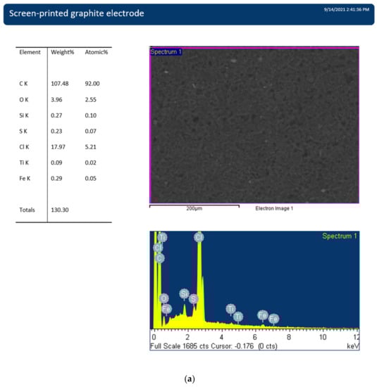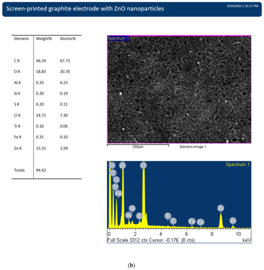 Scanning electron microscopy (SEM) imaging of SPEs, without and with a deposit of ZnO nanoparticles, was performed on a TESCAN Vega II XMU system (Brno, Czech Republic). An INCA X-Act detector (10 mm2) from Oxford Instruments (Bucks, UK) was attached for elemental analysis of the SPEs by energy dispersive X-ray (EDX) spectroscopy.