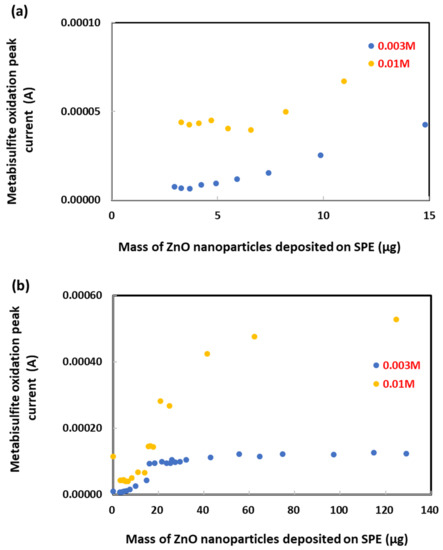 It has been shown above (in Figure 3) that a deposit of ZnO nanoparticles on the SPE produced a strong oxidation peak current for sodium metabisulfite. Further investigation revealed that, for any given metabisulfite concentration, there was a dependency between the oxidation peak current (measured at +1.2 V vs. Ag/AgCl) and the mass of ZnO nanoparticles deposited on SPE, as exemplified by 0.003 M and 0.01 M shown in Figure 5. A nearly linear current response was attained from 3 μg up to 15 μg of ZnO nanoparticles for 0.01 M metabisulfite. The lower detection limit of 3 µg is adequate for wastewater treatment analysis. This novel electrochemical oxidation method is conceptually different from our previous work that was based on surface catalytic activity and charge storage capacity [61]. Larger amounts (than 15 μg) of nanoparticles continued to increase the oxidation current nonlinearly until it reached a saturated current level at 60 μg of ZnO and beyond. However, as ZnO is an insulator, the mechanistic process behind these enhancements of the metabisulfite oxidation peak current was not simply based on the increments of SPE surface area by the deposited ZnO nanoparticles. It might be related to the oxidation activity of ZnO nanoparticles as reported previously by Al-Mohaimeed et al. [62].