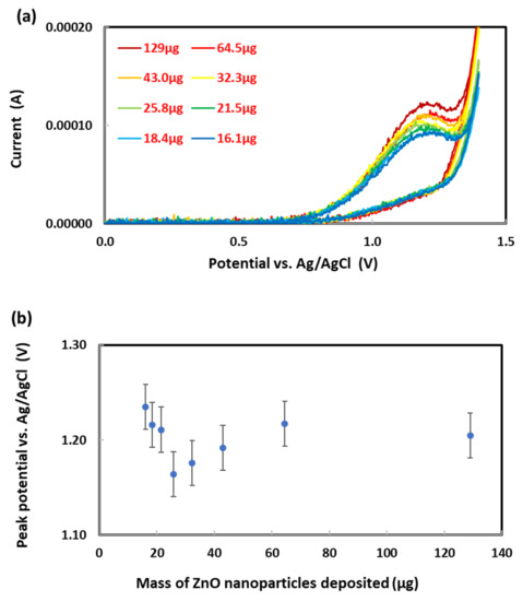 (a) Cyclic voltammograms of 0.003 M sodium metabisulfite on graphite electrodes deposited with different masses of ZnO nanoparticles. (b) Metabisulfite oxidation peak potential vs. mass of ZnO nanoparticles deposited.