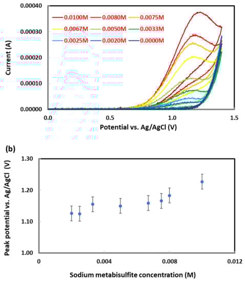 (a) Cyclic voltammograms of sodium metabisulfite at different concentrations on graphite electrodes deposited with 60 µg of ZnO nanoparticles. (b) Metasulfite oxidation peak potential vs. metabisulfite concentration tested.