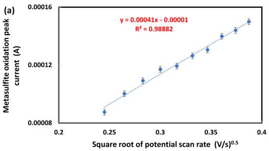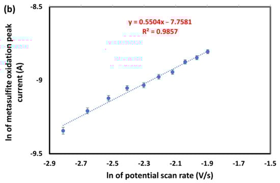 Changes in the cyclic voltammograms acquired at different scan rates can be used as diagnostic criteria for the investigation of various electrochemical reaction mechanisms, even for processes with a complex stoichiometry [65]. The peak current Ip (A) measured in the forward potential scan, is given (for the case of reversible electron transfer) by the Randles–Sevcik equation: Ip = (2.69 × 105)n3/2AD1/2Cν1/2, where n is the number of transferring electrons, A is the surface area of the graphite electrode (cm2), D is the diffusion coefficient (cm2 s−1), C is the bulk concentration (mol·cm−3), and n is the potential scan rate (V·s−1). We obtained information regarding the nature of the metabisulfite electrode process (if it is diffusion or adsorption controlled) by measuring the anodic peak current (Ipa) at different potential scan rates (ν) from 0.006 to 0.150 V/s. As shown in Figure 8a, a correlation coefficient of 0.9888 shows that the electron transfer was fast enough to maintain the equilibrium ratio between the reduced and the oxidized forms of the redox couple [66]. In Figure 8b, the logarithmic representation of ln(Ipa) versus ln(ν) generates a slope parameter that indicates whether the electrode process is diffusion or adsorption controlled. Indeed, the slope result of 0.5504 indicates a diffusion-controlled process for the oxidation of metabisulfite rather than one being controlled by adsorption.
