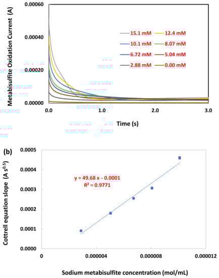 Chronoamperometric measurements of sodium metabisulfite at the graphite screen-printed electrode were carried out by setting the working electrode potential 1.40 V vs. Ag/AgCl for various concentrations as presented in Figure 9a. The metabisulfite oxidation current observed for the hydrolysis reaction (S2O52− + H2O → 2HSO3) followed by electrochemical oxidation: HSO3− + H2O → SO42− + 2e− + 3H+) under mass transport-limited conditions can be described by the Cottrell equation with a diffusion coefficient (D) [67]. Experimental plots of I vs. t−1/2 were drawn, and the best straight-line fittings for different concentrations of metabisulfite were determined. The slopes of the resulting straight lines were then plotted against metabisulfite concentrations in Figure 9b. From the resulting slope and the Cottrell equation, the value of D was found to be 4.16 × 10−5 cm2 s−1.