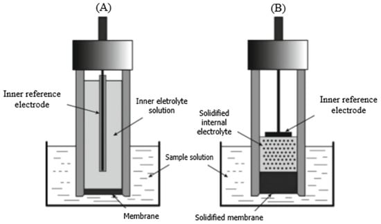 Diagram for the liquid contact ISE (A) and solid contact ISE (B).