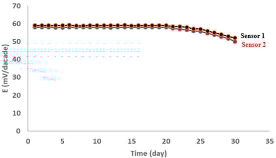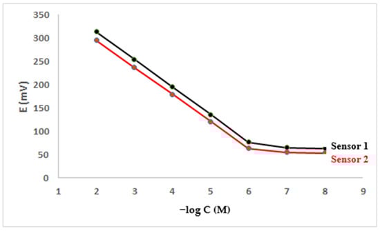 The sensors’ lifetime was explored by establishing calibration plots and by assessing their properties daily. The lifetimes for both sensors were determined to be 21 days when no changes in potentials (less than ±3 mV) were observed and calibration features were considered (Figure 5). The response time is an important parameter in the membrane performance evaluation, as it reflects the time needed for the manufactured electrode to give a constant reading (±1 mV) after a 10-fold rise in the sample concentration []. The constructed sensors’ response time was discovered to be 15 s.