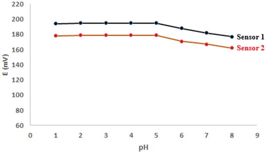 The pH of the medium influenced the operation of the manufactured sensors. The best electrochemical response was found to be in the pH range from 1.0 to 5.0. (Figure 4).