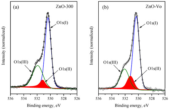 The state of oxygen on the ZnO surface was investigated by XPS. In both ZnO-300 and ZnO-VO samples, the oxygen atoms are represented by at least three charge states (Figure 6). O1s(I) state, with the lowest BE and highest intensity, refers to O2- ions in the ZnO crystal lattice; O1s(II) state, with a BE = 531.2 eV, can be assigned to oxygen ions located near oxygen vacancies [40]; O1s(III) state can appear due to the presence of OH-groups and chemisorbed oxygen on the ZnO surface [20]. The overall Zn:O ratio shows a superstoichiometric oxygen content for both ZnO-300 (1:1.22) and ZnO-VO (1:1.17) samples. The BEs of O1s charge states in the samples, as well as their relative content, are listed in Table 2.