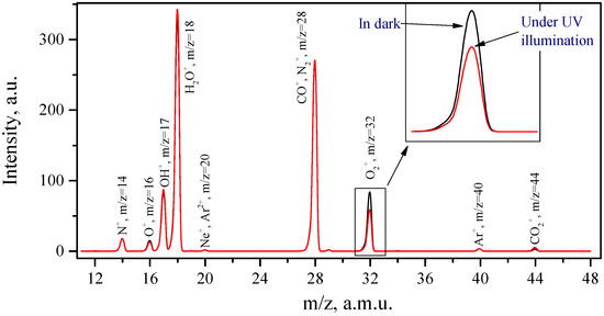 Photostimulated oxygen-related processes were studied using high-purity helium (residual oxygen content of about 0.15 ppm) as carrier gas. In order to achieve a steady state, a He gas was preliminary passed for several hours through the cell with ZnO tablets in dark. Figure 8 shows the mass spectrum in the range of 11–48 a.m.u. of carrier gas passing through the cell with ZnO tablets under stationary dark conditions (black line). The spectrum shows residual impurities including H2O vapor, O2, N2, Ar, and CO2, which are present at concentrations of less than 1 ppm. When the samples are irradiated with UV light through the quartz window of the cell (Figure 3), a noticeable decrease in the oxygen concentration in the carrier gas is registered (Figure 8). The absorption of oxygen from the carrier gas in this experiment indicates its photoadsorption, which occurs under UV radiation.