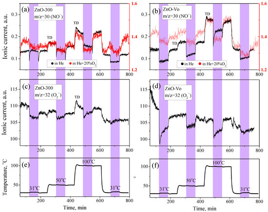 Changes in the ionic current during heating and UV illumination of ZnO tablets obtained from MS: (a) NO2 (m/z = 30) in an atmosphere of He/100 ppm NO2 (black line) and He/20% O2/100 ppm NO2 (red line) for ZnO-300 sample; (b) NO2 (m/z = 30) in an atmosphere of He/100 ppm NO2 (black line) and He/20% O2/100 ppm NO2 (red line) for ZnO-VO sample; (c) O2 (m/z = 32) in the He/100 ppm NO2 atmosphere for ZnO-300 sample; (d) oxygen (m/z = 32) in the He/100 ppm NO2 atmosphere for ZnO-VO sample; (e,f) temperature profile of the experiment.