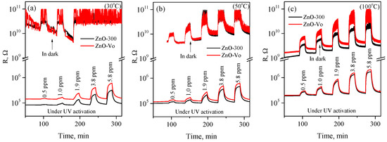 Gas-sensing measurements for ZnO-300 and ZnO-VO samples for NO2 in dark and under UV activation at 30 C (a), 50 C (b), and 100 C (c).