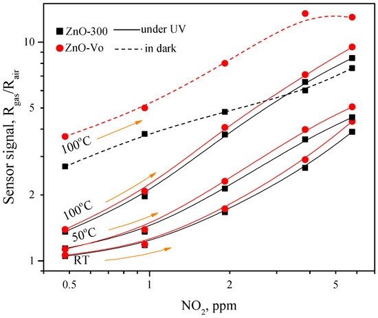 In dark at a constant temperature, equilibrium is established between the gaseous and adsorbed forms of NO2 according to Equations (14) and (15). The maximum achievable value of the sensor signal to NO2 in this case is controlled by the concentration of free electrons to the grains, which is not very high for nanocrystalline ZnO. As can be seen from Figure 11, the ZnO-300 and ZnO-VO samples show a sensor response to NO2 under dark conditions in the range of temperature of 30–100 C, but the very high resistance ( ) of the sensor layers, bordering on dielectric properties, makes it difficult to measure. With increasing temperature, the resistance of the sensors slightly decreases due to an increase in the concentration of charge carriers by the mechanism of thermal activation; however, the surface concentration of NO2 molecules decreases due to the predominant process of their thermal desorption. Thus, increasing the temperature does not appear to be a successful strategy for NO2 sensor measurements in the dark.