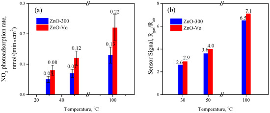(a) Diagram shows the photoadsorption rate of NO2 from an oxygen-rich atmosphere on ZnO-300 and ZnO-VO samples at different temperatures (data extracted from graphs in Figure 9); (b) diagram shows sensor response of ZnO-300 and ZnO-VO samples to 3.8 ppm NO2 at different temperatures (data extracted from graphs in Figure 12).
