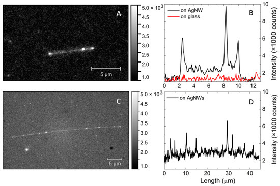 Fluorescence intensity maps of mCherry mixed with AgNWs (on the left) and cross-section along the silver nanowire and on glass (on the right). (A,B) sample with mCherry solution 0.5 µg/mL with AgNW, (C,D) sample with solution of single mCherry with AgNW.