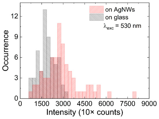 In order to visualize the influence of plasmon excitations in silver nanowires on the optical properties of mCherry protein, in particular the fluorescence intensity, we selected approximately 60 emission spots located on and off of the AgNWs. The histograms shown in Figure 3 were obtained by calculating the intensity of fluorescence intensity by integrating 5 × 5 pixel areas containing emission spots. In the selection process, we rejected agglomerates characterized by unusually high emission intensity. This procedure was applied for single mCherry proteins located in vicinity of AgNWs and compared with the emission intensity extracted for single mCherry proteins on glass. For proteins on glass, the distribution was rather narrow, centered around 1500 counts. On the other hand, the intensity distribution for mCherry imaged in the vicinity of silver nanowires was much broader and extended towards higher intensity values. Indeed, the average intensity measured in this case was approximately 3000 counts, i.e., twofold higher than in the case of mCherry on glass substrate. This behavior pointed towards the complexity of the structure, with a highly diluted protein layer, and may suggest that although the emission of mCherry proteins was optically located on the nanowire, in reality, the separation between mCherry and the nanowire was larger, perhaps significantly exceeding the 10–20 nm range, where strong plasmonic enhancement of fluorescence intensity is expected. This interpretation is supported first by the method of sample fabrication and second by the fact that a considerable number of single mCherry proteins imaged on silver nanowires featured emission intensities that fell within the range measured for mCherry on glass. We conclude that the high-intensity tail can be ascribed to the emission of mCherry proteins that were closer to the silver nanowires, thus experiencing a stronger plasmon enhancement effect. Therefore, based on this fluorescence imaging experiment, which nevertheless suggested the emergence of plasmonic enhancement of fluorescence, it was not possible to estimate the scale of the enhancement. This would require developing ways of controlling the morphology of the structure.
