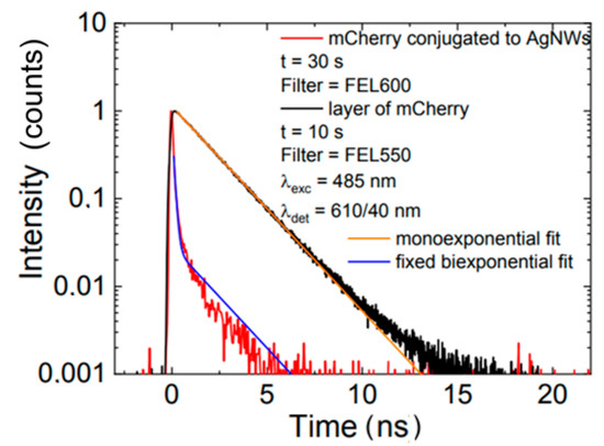 The influence of plasmon excitations in silver nanowires on the optical properties of mCherry protein was unambiguously demonstrated using fluorescence decay time measurement. The fluorescence transients obtained for mCherry conjugated to AgNW and for mCherry on a glass substrate are displayed in Figure 5. In the case of protein conjugated with AgNW, we observed significant shortening of the fluorescence decay time compared with the result for mCherry on glass, which showed monoexponential behavior with a decay constant equal to 1.86 ns. Indeed, for mCherry conjugated with AgNW, biexponential decay was measured with two time components: 0.1 ns (comparable to the temporal resolution of the experimental setup) and 1.86 ns, which was fixed. The fits are included in Figure 5. This strong reduction in the fluorescence decay time indicated strong interaction between mCherry and plasmon excitations in the nanowire.