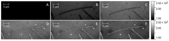The ability to enhance the optical response of the mCherry protein upon conjugation with silver nanowire prompted us to apply this scheme to monitor conjugation in real time using wide-field fluorescence imaging. First, a droplet of silver nanowires was deposited on a glass coverslip, and the positions of the nanowires were determined using the transmission mode of the microscope (Figure S3, Supplementary Materials). Then, acquisition of a film started; the snapshots taken at increased time intervals are shown in Figure 6. The first image proved that functionalized AgNWs themselves were nonemitting (Figure 6A), while upon depositing a 5 µL droplet of mCherry solution onto the sample surface, fluorescence emerged. The moment of deposition is presented in Figure 6B. We observed a rapid increase in fluorescence in the background, but the AgNWs remained dark. After 15 s (Figure 6C), the ends of the nanowires became brighter because of the specific attachment of mCherry protein. After approximately 80 s, the intensity along AgNWs rapidly built up over time until all the nanowires were homogeneously covered by the protein (Figure 6D–F). The time to start the conjugation process by His-tag attachment to Ni-NTA-modified AgNWs was about 20 s, slower than conjugation by the streptavidin–biotin linker, which was described recently and is expected to be faster because of the extraordinarily high affinity between the ligand and the protein [26]. However, the time of conjugation seemed to be much faster than measured previously [33]. We emphasize that the observation of protein attachment to silver nanowire was significantly helped by the effect of plasmon–enhanced fluorescence.