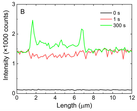 The temporal behavior of fluorescence intensity upon depositing a droplet of mCherry onto a substrate with silver nanowires was visualized by extracting single-pixel intensity of emission as a function of time. The result of this procedure is shown in Figure 7A, where the intensity of a single pixel on (blue) and off (black) the nanowire is plotted as a function of time. The emission of fluorescence at the nanowire increased over time and reached saturation after approximately 150 s, with some minimal decrease perhaps due to the photobleaching effect. On the other hand, the fluorescence signal from mCherry in the background was highest at the beginning of the sequence, with a subsequent gradual decrease probably caused by the attachment of mCherry protein to the AgNWs and the photobleaching effect. The variation in the fluorescence intensity on and off the nanowire with time is also clearly visible on the temporal map shown in Figure S4 of the Supplementary Materials.